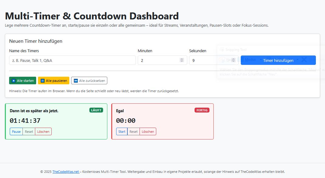 🕒Browserbasiertes Multi-Timer-Tool: beliebig viele Timer mit Name und Dauer anlegen, einzeln oder alle gemeinsam starten/pausieren/zurücksetzen. Perfekt für Moderation, Pausenmanagement, Fokus-Sessions oder Live-Streams. Läuft komplett lokal im Browser, ohne Datenbank.