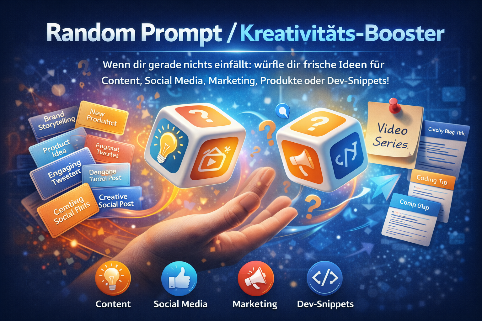 Der Random Prompt / Kreativitäts-Booster liefert dir mit einem Klick frische Ideen-Prompts für Content, Social Media, Marketing, Produktideen und Coding. Du wählst eine Kategorie (z. B. Content & Blogging, Social Media, Marketing, Produktideen, Coding) und das Tool kombiniert zufällig Thema, Zielgruppe, Blickwinkel, Tonalität und Rahmenbedingungen zu einem klaren, direkt nutzbaren Prompt. Perfekt, wenn du: – an einem leeren Dokument hängst, – neue Content-Ansätze für Blog, Newsletter oder Social Media brauchst, – Inspiration für kleine digitale Produkte oder Dev-Ideen suchst. Den generierten Prompt kannst du mit einem Klick kopieren und direkt in ChatGPT, Claude, Gemini oder dein eigenes Notizsystem einfügen. Das Tool läuft komplett auf deinem Webspace, ohne Datenbank und ohne externe Speicherung – ideal für schnelle Kreativ-Sessions.