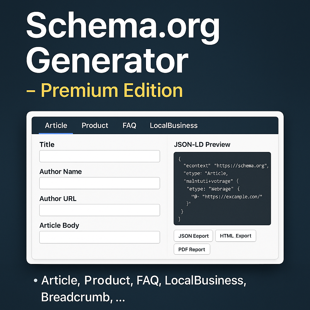 Der JSON-LD Schema Generator (Premium) ist ein leistungsstarkes, vollständig lokal laufendes SEO-Tool zur Erstellung strukturierter Daten für Webseiten, Online-Shops, Blogs, Unternehmen und Agenturen. Mit nur wenigen Klicks erzeugst du perfekt formatiertes, Google-konformes JSON-LD für über 16 professionelle Schema.org-Typen – inklusive Live-Vorschau und Exportfunktionen. Kein Login, keine API, keine Cloud – alles läuft auf deinem eigenen Webspace. 🚀 Warum dieses Tool? Strukturierte Daten sind einer der wichtigsten SEO-Rankingfaktoren. Google nutzt sie für Rich Results, Knowledge Panels, FAQ-Snippets, Produktdarstellungen, Event-Karten, Sternebewertungen u. v. m. Der Premium-Generator spart dir unzählige Stunden manueller Arbeit, vermeidet Fehler und liefert sofort einsatzbereites JSON-LD, das garantiert lesbar und valide ist. 🧩 Enthaltene Schema-Module (16 Typen) Alle Module sind vollständig integriert, mit eigenen Eingabefeldern und automatisch generiertem JSON-LD: 🔹 Content & Artikel Article NewsArticle BlogPosting HowTo VideoObject 🔹 FAQ & Informationen FAQPage BreadcrumbList 🔹 Produkte & Commerce Product Review AggregateRating 🔹 Events Event 🔹 Unternehmen LocalBusiness Organization Person 🔹 Rezepte & Special Content Recipe 👉 Damit deckt das Tool praktisch alle relevanten Schema-Typen ab, die Google in SERPs darstellt. 🛠️ Funktionen & Vorteile ✔ 16 vollintegrierte Schema-Module Für Blogs, Shops, Unternehmen, Events, Jobs, Rezepte, Videos – alles in einem Tool. ✔ Live JSON-LD Vorschau Die generierten Daten werden live formatiert dargestellt. ✔ Fehlerfreie Ausgabe Alle Eigenschaften werden automatisch korrekt formatiert – keine JSON-Syntaxfehler. ✔ Keine API, keine Limits, kein Abo 100 % lokal → DSGVO-konform & blitzschnell. ✔ Exporte für professionelle Workflows PDF-Report (tFPDF, stabil & sauber formatiert) JSON-Export HTML-Export (script-Block) PNG-Export (Screenshot des Outputs) Perfekt für SEO-Dokumentationen, Kundenprojekte und Audits. ✔ Intuitive Eingabeoberfläche Klare Struktur, selbsterklärende Felder, sofort einsetzbar. ✔ Demo- und Premium-Modus In der Demo sind nur Article und FAQ aktiv. Die Premium-Version schaltet alle 16 Module + Exporte frei. Der JSON-LD Schema Generator (Premium) ist ein leistungsstarkes, vollständig lokal laufendes SEO-Tool zur Erstellung strukturierter Daten für Webseiten, Online-Shops, Blogs, Unternehmen und Agenturen. Mit nur wenigen Klicks erzeugst du perfekt formatiertes, Google-konformes JSON-LD für über 16 professionelle Schema.org-Typen – inklusive Live-Vorschau und Exportfunktionen. Kein Login, keine API, keine Cloud – alles läuft auf deinem eigenen Webspace. 🚀 Warum dieses Tool? Strukturierte Daten sind einer der wichtigsten SEO-Rankingfaktoren. Google nutzt sie für Rich Results, Knowledge Panels, FAQ-Snippets, Produktdarstellungen, Event-Karten, Sternebewertungen u. v. m. Der Premium-Generator spart dir unzählige Stunden manueller Arbeit, vermeidet Fehler und liefert sofort einsatzbereites JSON-LD, das garantiert lesbar und valide ist. 🧩 Enthaltene Schema-Module (16 Typen) Alle Module sind vollständig integriert, mit eigenen Eingabefeldern und automatisch generiertem JSON-LD: 🔹 Content & Artikel Article NewsArticle BlogPosting HowTo VideoObject 🔹 FAQ & Informationen FAQPage BreadcrumbList 🔹 Produkte & Commerce Product Review AggregateRating 🔹 Events Event 🔹 Unternehmen LocalBusiness Organization Person 🔹 Rezepte & Special Content Recipe 👉 Damit deckt das Tool praktisch alle relevanten Schema-Typen ab, die Google in SERPs darstellt. 🛠️ Funktionen & Vorteile ✔ 16 vollintegrierte Schema-Module Für Blogs, Shops, Unternehmen, Events, Jobs, Rezepte, Videos – alles in einem Tool. ✔ Live JSON-LD Vorschau Die generierten Daten werden live formatiert dargestellt. ✔ Fehlerfreie Ausgabe Alle Eigenschaften werden automatisch korrekt formatiert – keine JSON-Syntaxfehler. ✔ Keine API, keine Limits, kein Abo 100 % lokal → DSGVO-konform & blitzschnell. ✔ Exporte für professionelle Workflows PDF-Report (tFPDF, stabil & sauber formatiert) JSON-Export HTML-Export (script-Block) PNG-Export (Screenshot des Outputs) Perfekt für SEO-Dokumentationen, Kundenprojekte und Audits. ✔ Intuitive Eingabeoberfläche Klare Struktur, selbsterklärende Felder, sofort einsetzbar. ✔ Demo- und Premium-Modus In der Demo sind nur Article und FAQ aktiv. Die Premium-Version schaltet alle 16 Module + Exporte frei. 🎯 Ideal für SEO-Agenturen & Webdesigner Marketing-Teams Online-Shops Blogger & Publisher Freelancer Unternehmen aller Größen 🔒 100 % DSGVO-konform Keine Daten verlassen den Server. Kein Tracking. Das Tool funktioniert vollständig offline. 💬 Fazit Der JSON-LD Schema Generator (Premium) ist eines der umfangreichsten Schema-Tools am Markt – jedoch ohne monatliche Kosten. Perfekt für alle, die Rich Snippets, SEO-Transparenz und professionelle strukturiere Daten benötigen. 💰 Preis 39 € (einmalig) ✓ Lifetime-Lizenz ✓ Alle Premium-Module ✓ Exportfunktionen ✓ Kostenlose Updates